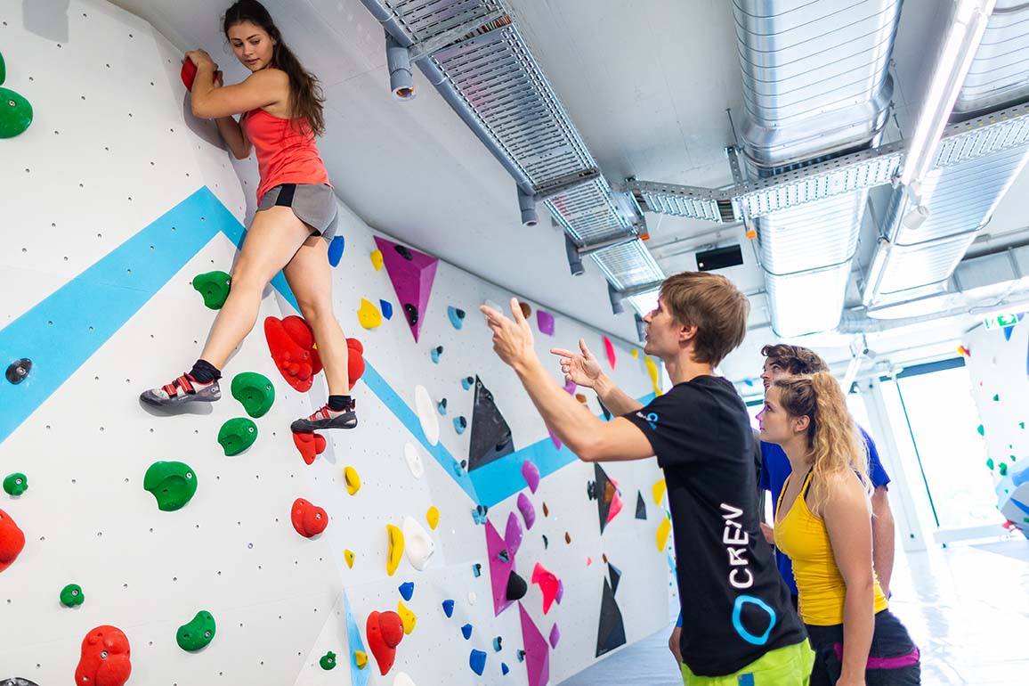 Erste Techniken fürs Bouldern und Klettern lernen im Grundkurs mit Trainer der Boulderwelt