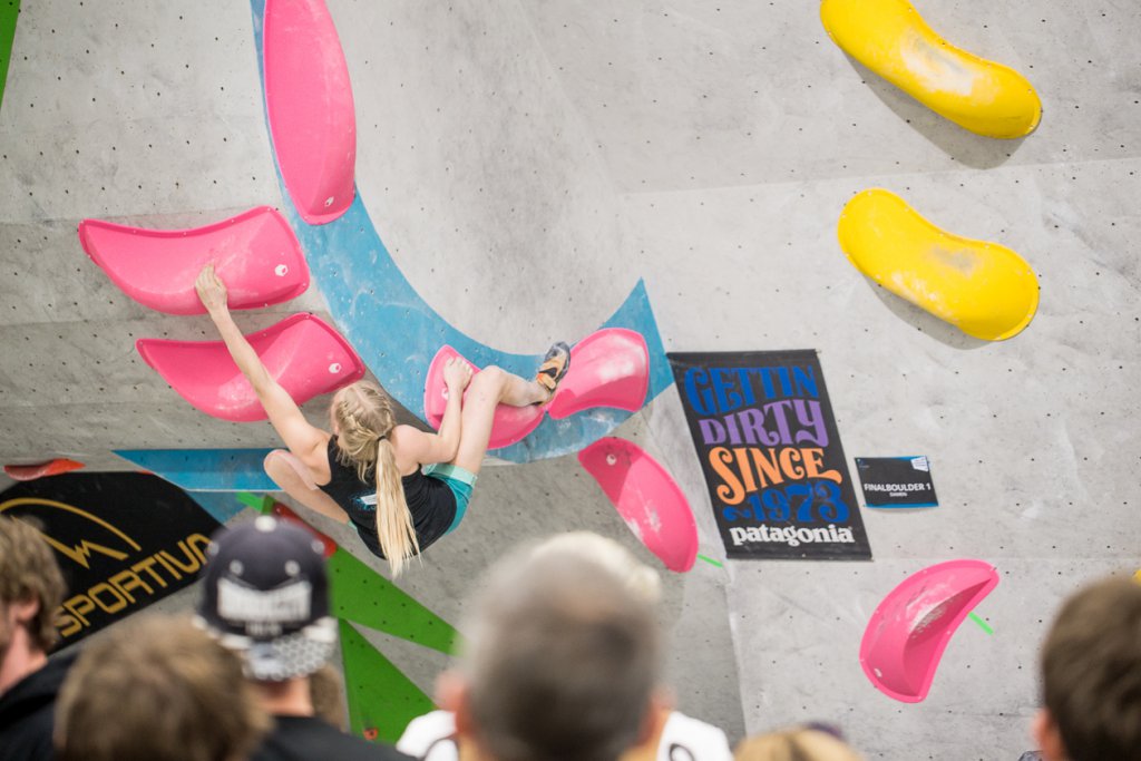 Die Umschraubpause für´s Finale wurde geschwind für einen Special Contest genutzt: die Speed-Traverse durfte her! Der wackelige schwarze Boulder im neugebauten runden Eck wurde in drei Runden modifiziert und so zu einem spektakulären Runner gemacht. Bei den Mädels trauten sind zwei ganz junge Nachwuchstalente aus Kempten ran und meisterten die ersten Runden mit Bravour. Die dritte und schwerste Runde gewann schlussendlich Tabea und sicherte sie die geile Patagonia Hybrid Jacke. Bei den Jungs war das Ganze sehr spannend, denn bis zum letzte Go wusste man nicht ob die Höchstzeit wieder unterboten werden würde. Doch Yuk aka. unser lieber „Little“ lief so solide durch den Boulder und sicherte sich mit 3,61 Sekunden die zweite Jacke!
