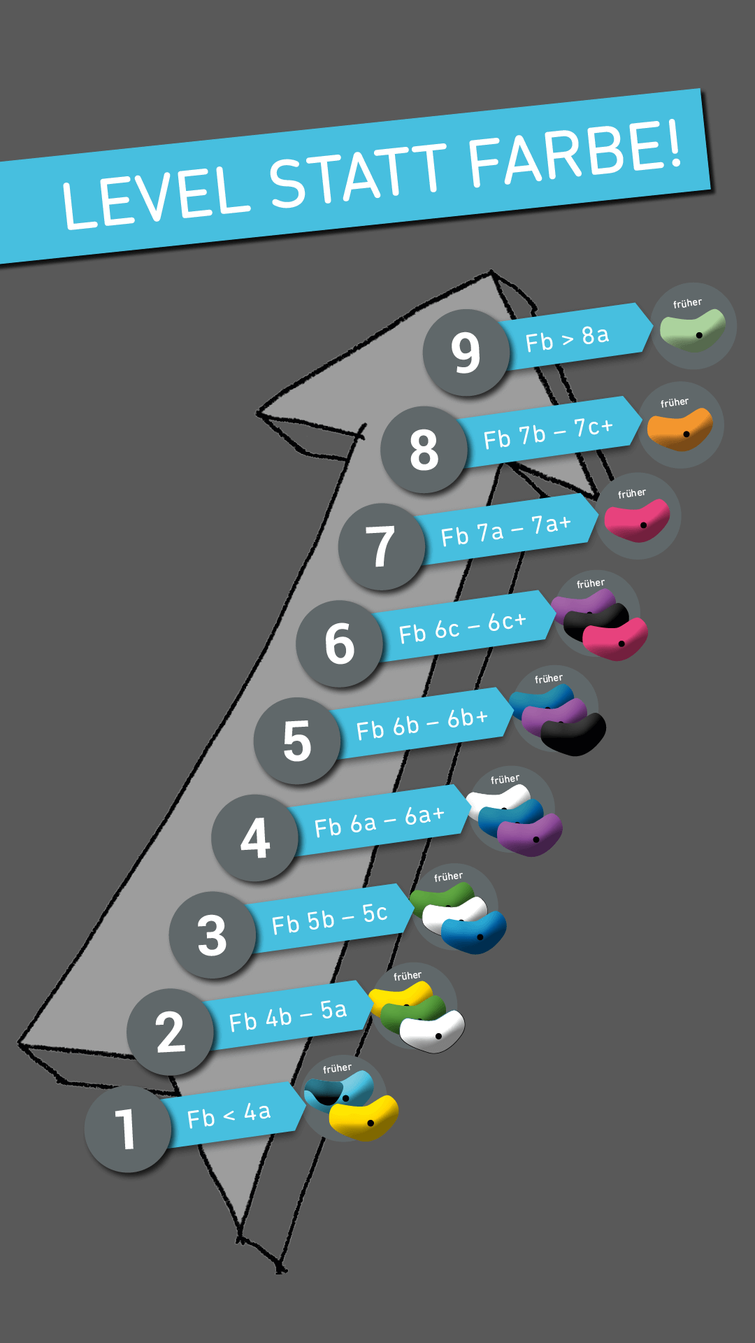- Jede Levelzahl steht für einen definierten Schwierigkeitsbereich. So sind beispielsweise alle Boulder in Level 6 vergleichbar schwer, unabhängig von der Farbe der Griffe.