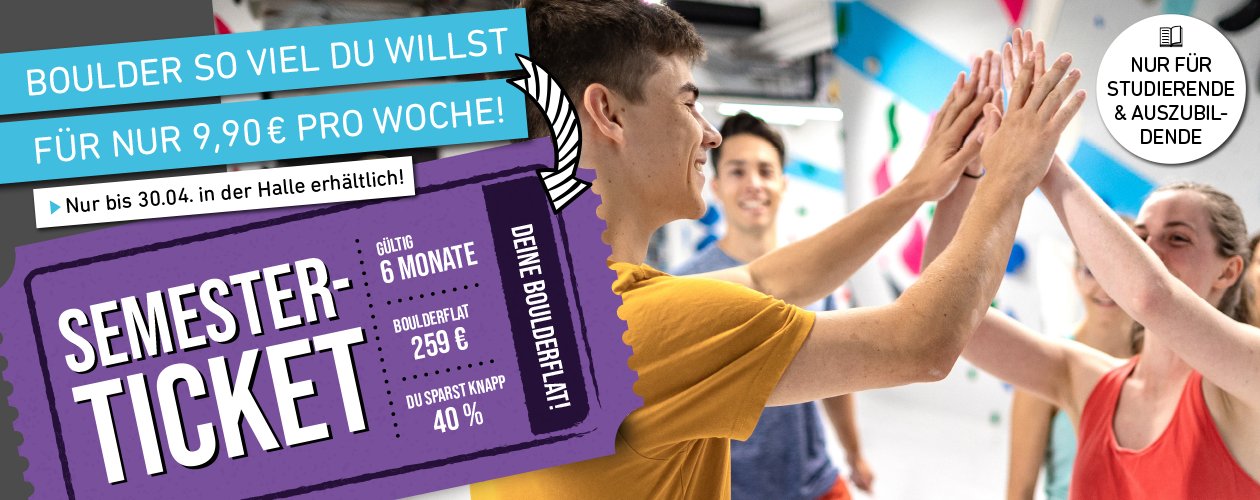 und hole Dir Deine 6-Monate-Boulderflat mit dem Semesterticket für nur 259 €.